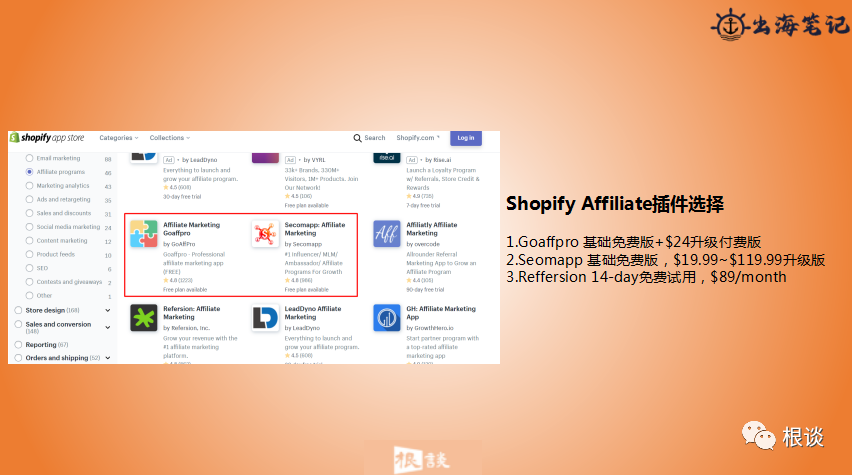 首先我们看第一步,shopify affiliate插件选择,可以在shopify的app store -marketing-affiliate program下面找到,我们根据用户评分最多的推荐了3款
